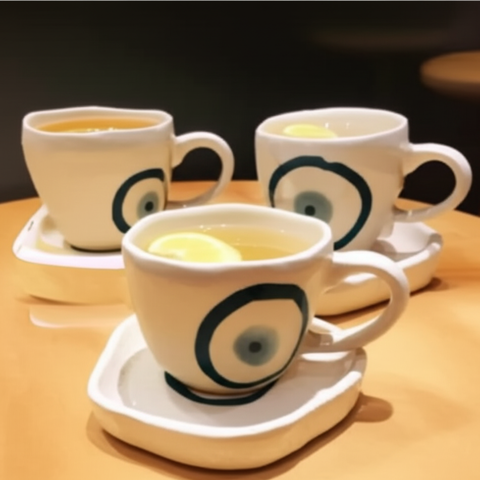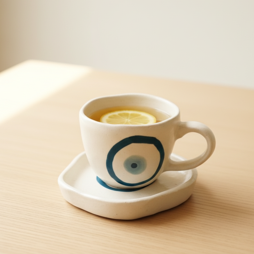 A fusion of elegance and symbolism, this cup and saucer set embodies both artistry and protection. The pristine ivory surface is adorned with hand-painted concentric motifs in deep teal, echoing the revered evil eye—an ancient emblem of safeguarding and positive energy. Its organic curves and sculpted saucer add a modern, artisanal touch, while the balanced handle ensures refined comfort. Designed for tea rituals that transcend the ordinary, it transforms every sip into a moment of beauty, belief, and luxury.